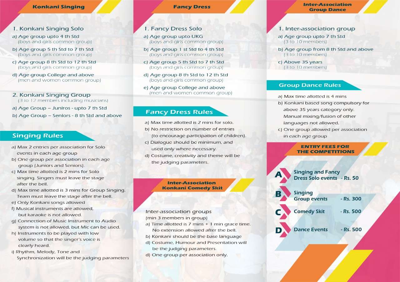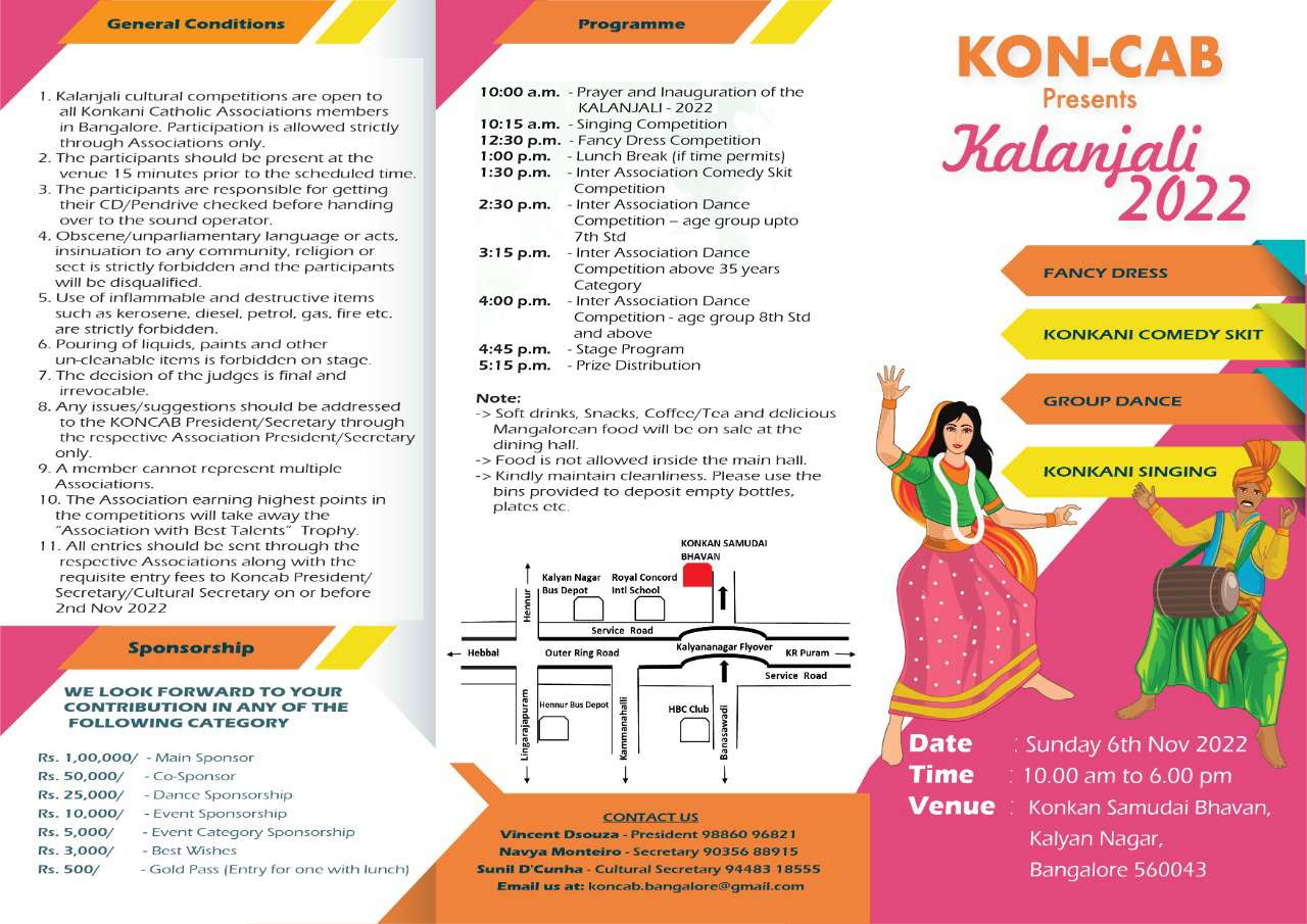 This year KONCAB will present this grand cultural competition festival KALANJALI-2022 depicting the tradition and culture of the Konkani speaking community on Sunday 6th November 2022 at Konkan Samudai Bhavan, Kalyan Nagar, Bangalore -560043 from 10.00 a.m. to 6.00 p.m. There will be individual and group competitions for different age groups in Konkani Singing and Fancy Dress. Also, there will be inter-association competitions in Group Dance, Konkani Comedy Skit, Singing and Fancy Dress Competitions.