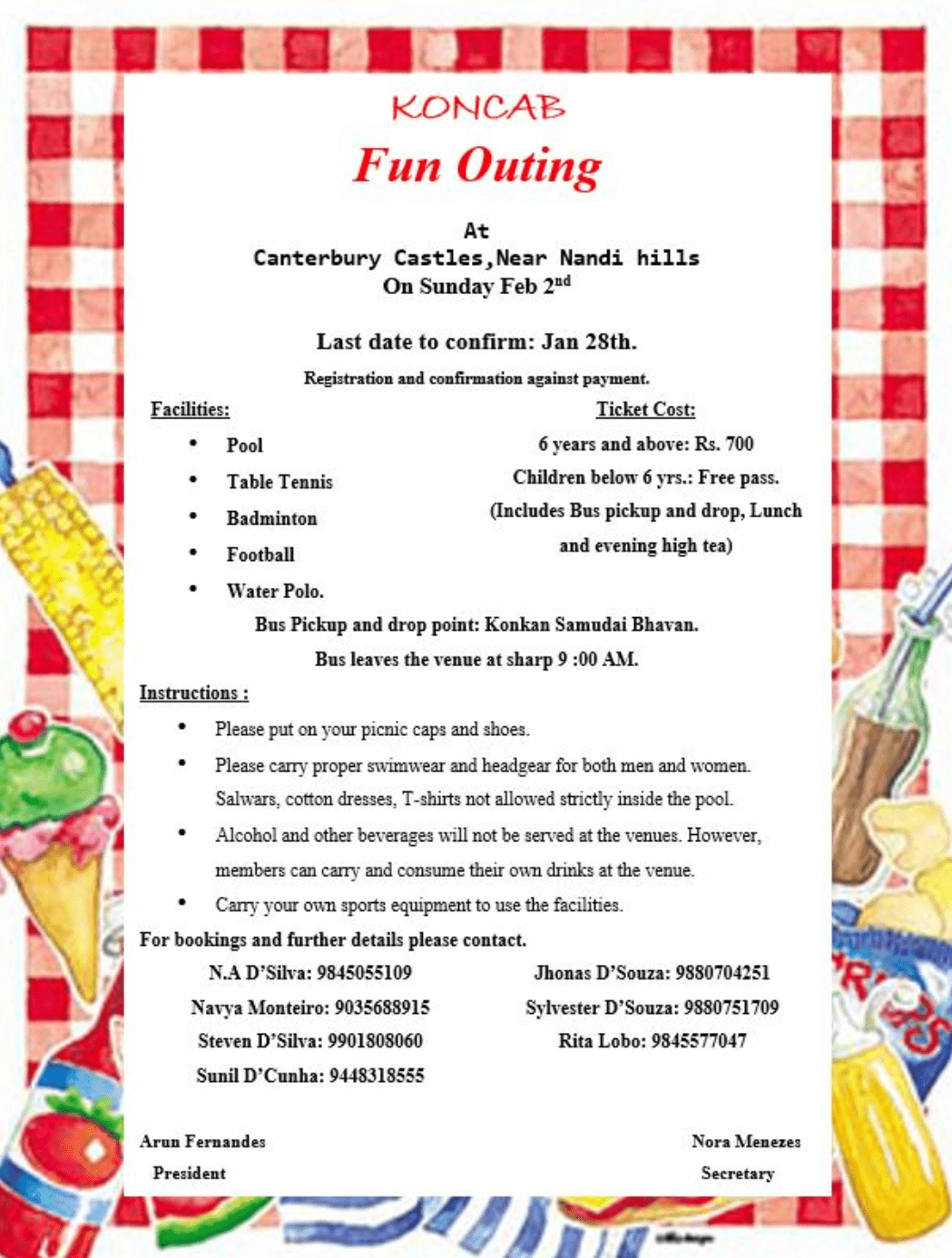 Koncab will be organising Annual Members Picnic on Sunday, February 2nd 2020 at Ferns Aspen Heights .